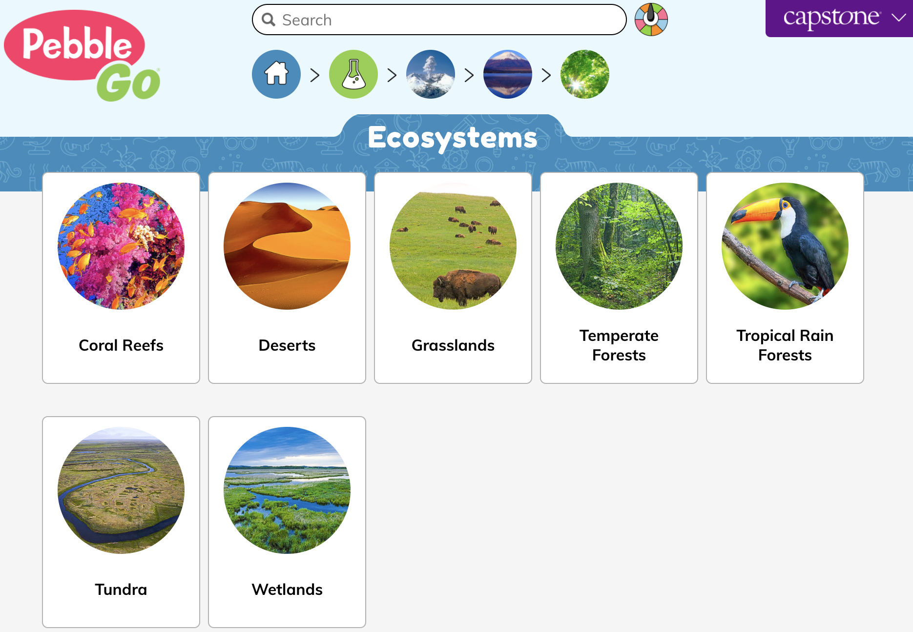 • Read about coral reefs, deserts, grasslands, temperate forests, tropical rain forests, tundra, and wetlands.