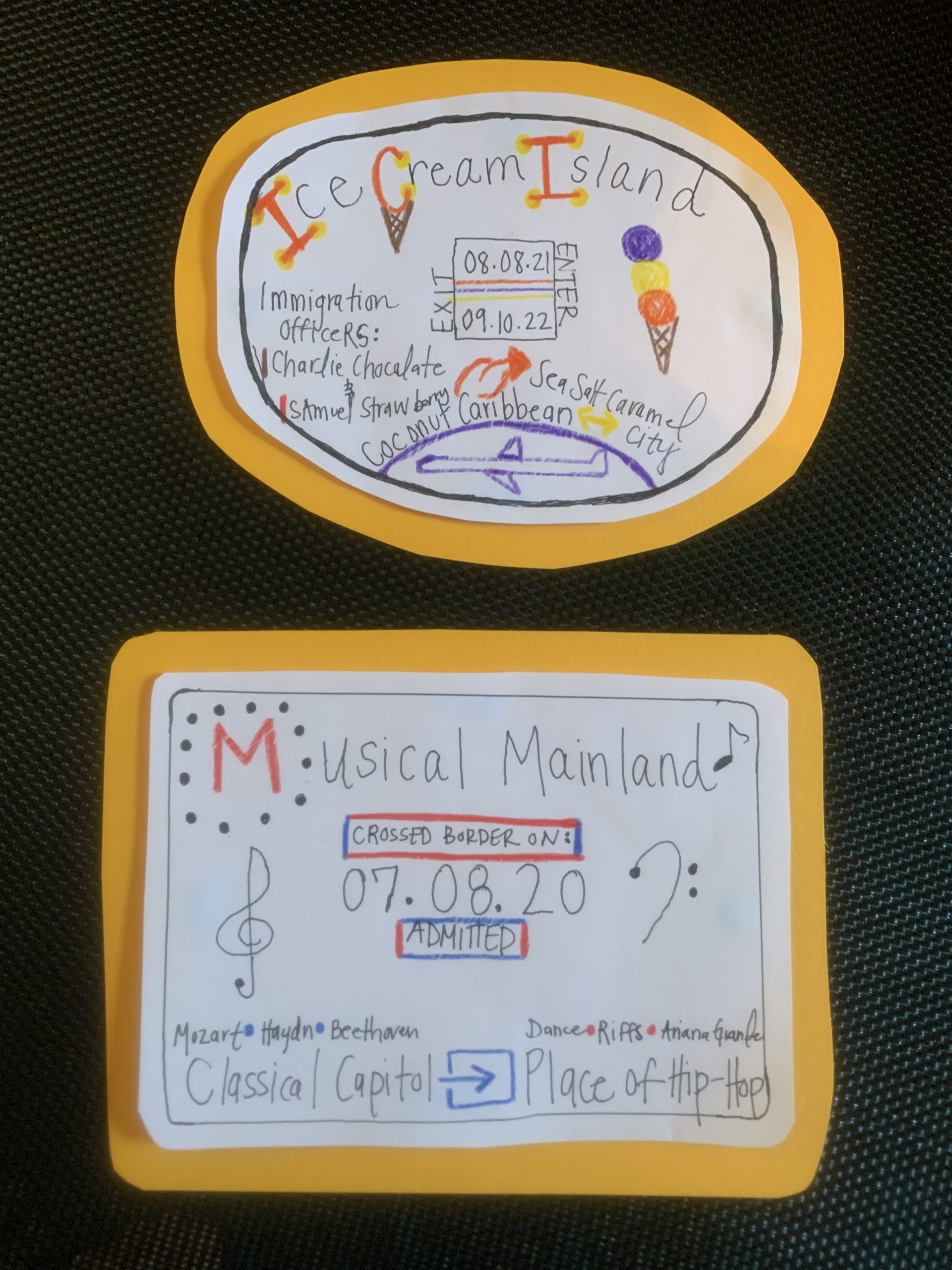 3. Get arty, using travel as your guide.   Make a passport stamp or entry visa for your own country.  Use your imagination!  Here are two designed by friends who love to eat ice cream and sing.  Do these look like your passport stamps?  What can you create?