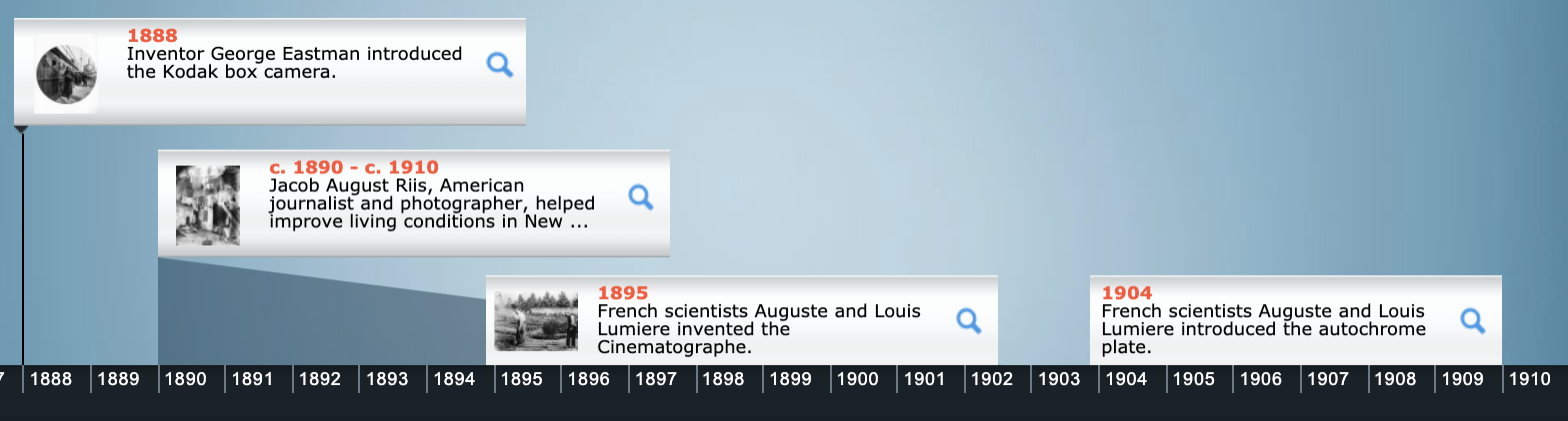3. Project Idea:  Create a Timeline: Time is sometimes a difficult concept for young children to understand.  Timelines are graphic representation of events in the order that they happened.  Often, time is shown on a line with the oldest events on the left and more recent events on the right.  Here is a sample from our World Book Timelines module from the History of Photography: